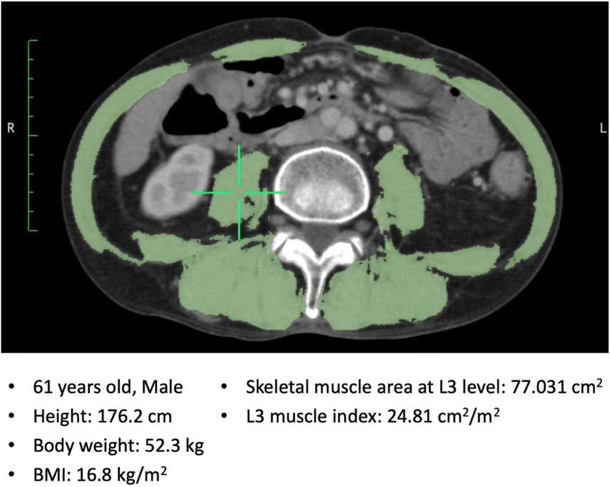 - Clinical impact of skeletal muscle area in patients with non-small cell lung cancer treated with anti-PD-1 inhibitors – Scientific Figure on ResearchGate. Available from: https://www.researchgate.net/figure/Representative-image-of-the-skeletal-muscle-area-at-the-L3-level-The-skeletal-muscle_fig1_339059671